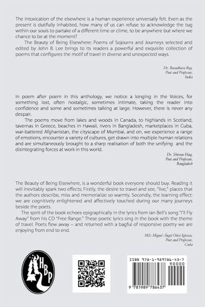 The Beauty of Being Elsewhere: poems of journey and sojourn is a selection of poems, collected and edited, by world class poet, John B. Lee by world class poets from around the world with world wide photographs by world class photographer Richard M. Grove. This 300 page book will take you and your imagination around the world in the comfort of your arm chair. It includes three essays by three world class academic scholars, Professor Basudara Roy from India, Professor Shireen Huq from Bangladesh and Professor Miguel Ángel Olivé Iglesias from Cuba.