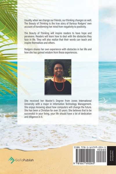 Usually, when we change our friends, our thinking changes as well. The Beauty of Thinking is the true story of Barissa Rodgers' own account of transforming her mind from negativity to positivity. The Beauty of Thinking will inspire readers to have hope and persevere. Readers will learn how to deal with the obstacles they face in life. They will also realize that their words can teach and inspire themselves and others. Rodgers shares her own experience with obstacles in her life and how she has gained wisdom from these experiences.