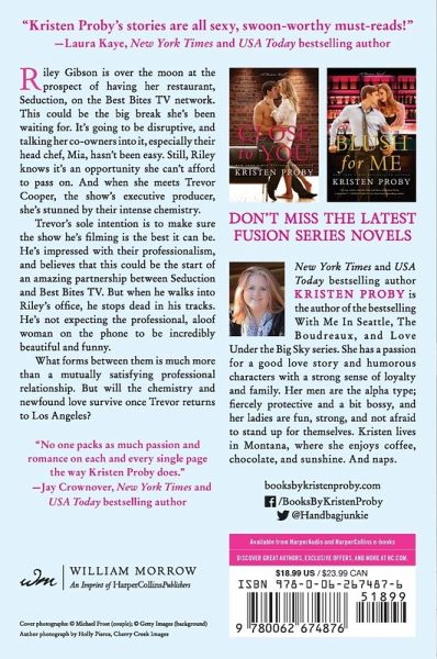 New York Times bestselling author Kristen Proby delivers another sizzling novel in her delectable and sexy Fusion series. Riley Gibson is over the moon at the prospect of having her restaurant, Seduction, on the Best Bites TV network. This could be the big break shes been waiting for. But the idea of having an in-house show on a regular basis is a whole other matter. Their lives would be turned upside down, and convincing Mia, her best friend and head chef of Seduction, that having cameras in her kitchen every day is a good idea is daunting. Still, Riley knows its an opportunity she cant afford to pass on. And when she meets Trevor Cooper, the shows executive producer, shes stunned by their intense chemistry. Trevors sole intention is to persuade Riley to allow Best Bites TV to do a show on her restaurant. But when he walks into Rileys office, he stops dead in his tracks. The professional, aloof woman on the phone is incredibly beautiful and funny. But can he convince her that hes interested in Riley for himself? Or is he using the undeniable pull between them to persuade her to agree to his offer?