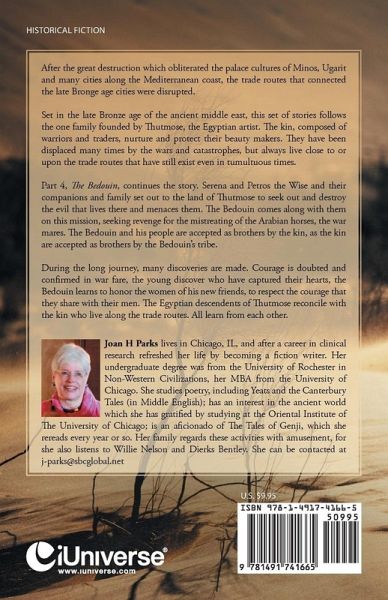 After the great destruction which obliterated the palace cultures of Minos, Ugarit and many cities along the Mediterranean coast, the trade routes that connected the late Bronge age cities were disrupted. Set in the late Bronze age of the ancient middle east, this set of stories follows the one family founded by Thutmose, the Egyptian artist. The kin, composed of warriors and traders, nurture and protect their beauty makers. They have been displaced many times by the wars and catastrophes, but always live close to or upon the trade routes that have still exist even in tumultuous times. Part 4, The Bedouin, continues the story. Serena and Petros the Wise and their companions and family set out to the land of Thutmose to seek out and destroy the evil that lives there and menaces them. The Bedouin comes along with them on this mission, seeking revenge for the mistreating of the Arabian horses, the war mares. The Bedouin and his people are accepted as brothers by the kin, as the kin are accepted as brothers by the Bedouin's tribe. During the long journey, many discoveries are made. Courage is doubted and confirmed in war fare, the young discover who have captured their hearts, the Bedouin learns to honor the women of his new friends, to respect the courage that they share with their men. The Egyptian descendents of Thutmose reconcile with the kin who live along the trade routes. All learn from each other.