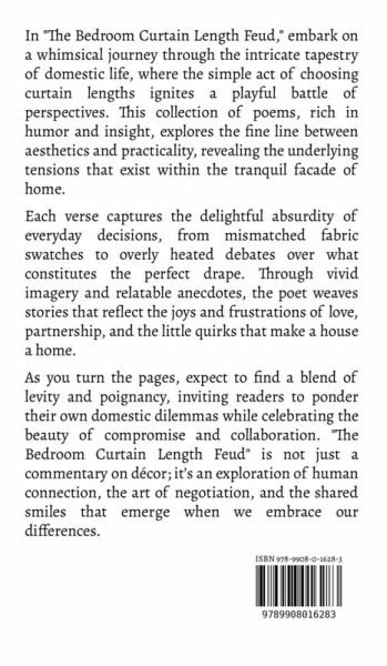 In "The Bedroom Curtain Length Feud," embark on a whimsical journey through the intricate tapestry of domestic life, where the simple act of choosing curtain lengths ignites a playful battle of perspectives. This collection of poems, rich in humor and insight, explores the fine line between aesthetics and practicality, revealing the underlying tensions that exist within the tranquil facade of home. Each verse captures the delightful absurdity of everyday decisions, from mismatched fabric swatches to overly heated debates over what constitutes the perfect drape. Through vivid imagery and relatable anecdotes, the poet weaves stories that reflect the joys and frustrations of love, partnership, and the little quirks that make a house a home. As you turn the pages, expect to find a blend of levity and poignancy, inviting readers to ponder their own domestic dilemmas while celebrating the beauty of compromise and collaboration. "The Bedroom Curtain Length Feud" is not just a commentary on décor; it's an exploration of human connection, the art of negotiation, and the shared smiles that emerge when we embrace our differences.