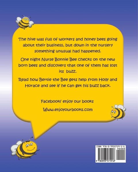Delightful children's rhyming book full of colourful illustrations about Bertie, a baby bee that loses his buzz. His friends Horace and Bonnie find an ingenious way of helping him get his buzz. Horace invents a pair of magical buzzing boots that Bertie can wear and surprises evryone on the hive.