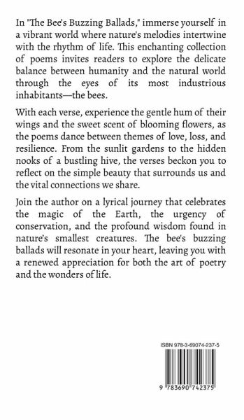 In "The Bee's Buzzing Ballads," immerse yourself in a vibrant world where nature's melodies intertwine with the rhythm of life. This enchanting collection of poems invites readers to explore the delicate balance between humanity and the natural world through the eyes of its most industrious inhabitants-the bees. With each verse, experience the gentle hum of their wings and the sweet scent of blooming flowers, as the poems dance between themes of love, loss, and resilience. From the sunlit gardens to the hidden nooks of a bustling hive, the verses beckon you to reflect on the simple beauty that surrounds us and the vital connections we share. Join the author on a lyrical journey that celebrates the magic of the Earth, the urgency of conservation, and the profound wisdom found in nature's smallest creatures. The bee's buzzing ballads will resonate in your heart, leaving you with a renewed appreciation for both the art of poetry and the wonders of life.