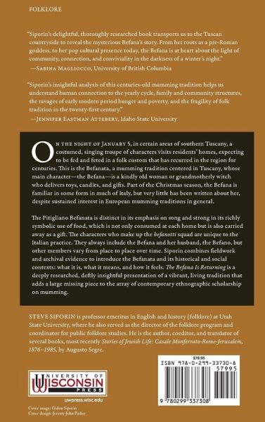 On the night of January 5, in certain areas of southern Tuscany, a costumed, singing troupe of characters visits residents’ homes, expecting to be fed and feted in a folk custom that has recurred in the region for centuries. This is the Befanata, a mumming tradition centered in Tuscany, whose main character—the Befana—is a kindly old woman or grandmotherly witch who delivers toys, candies, and gifts. Part of the Christmas season, the Befana is familiar in some form in much of Italy, but very little has been written about her, despite sustained interest in European mumming traditions in general. The Pigitliano Befanata is distinct in its emphasis on song and strong in its richly symbolic use of food, which is not only consumed at each home but is also carried away as a gift. The characters who make up the squad are unique to the Italian practice. They always include the Befana and her husband, the Befano, but other members of the befanotti vary from place to place over time. Siporin combines fieldwork and archival evidence to introduce the Befanata and its historical and social contexts: what it is, what it means, and how it feels. The Befana Is Returning is a deeply researched, deftly insightful presentation of this living tradition that adds a large missing piece to the array of contemporary ethnographic scholarship on mumming.