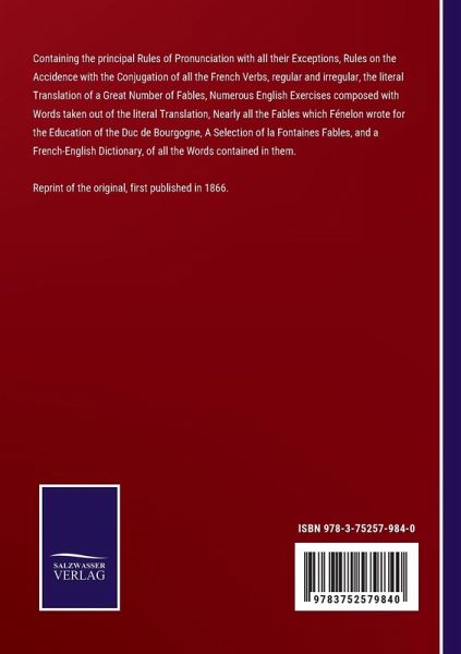 Reprint of the original, first published in 1866. Containing the principal Rules of Pronunciation with all their Exceptions, Rules on the Accidence with the Conjugation of all the French Verbs, regular and irregular, the literal Translation of a Great Number of Fables, Numerous English Exercises composed with Words taken out of the literal Translation, Nearly all the Fables which Fénelon wrote for the Education of the Duc de Bourgogne, A Selection of la Fontaines Fables, and a French-English Dictionary, of all the Words contained in them.