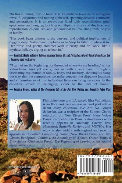 Elsa Valmidiano's The Beginning of Leaving is a hybrid collection of journalistic prose and lyrical essays, weaving a personal examination of how leaving not only reflects a picture of immigration and the diaspora, but how migration through generations compels any individual to honor the Motherland we left behind, and acknowledge whose land we now inhabit and have adopted as our own. In these essays, leaving is not simply a finite act but a process of resistance, reconciliation, and release-from a Motherland, a childhood, War, a body, a mindset, a painful past, or shame. Within this collection is a reflective and immersive travelogue as well as bildungsroman of a woman who is the daughter of Filipino immigrants. As she travels from her ancestral barrios in the Philippines, to the suburbs of LA, to the High Desert of California, and finally to the Australian Outback in Murujuga, themes of heartbreak, family, trauma, and race are intimately interwoven inside discussions surrounding gender expectations, as well as Motherland values versus adopted homeland values.