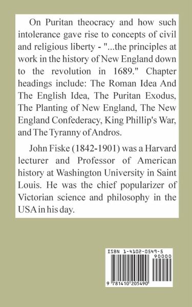 On Puritan theocracy and how such intolerance gave rise to concepts of civil and religious liberty - "...the principles at work in the history of New England down to the revolution in 1689." Chapter headings include: The Roman Idea And The English Idea, The Puritan Exodus, The Planting of New England, The New England Confederacy, King Phillip's War, and The Tyranny of Andros. John Fiske (1842-1901) was a Harvard lecturer and Professor of American history at Washington University in Saint Louis. He was the chief popularizer of Victorian science and philosophy in the USA in his day.