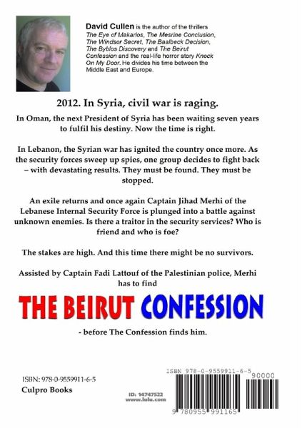 2012. In Syria, civil war is raging. In Oman, the next President of Syria has been waiting seven years to fulfil his destiny. Now the time is right. In Lebanon, the Syrian war has ignited the country once more. As the security forces sweep up spies, one group decides to fight back - with devastating results. They must be found. They must be stopped. An exile returns and once again Captain Jihad Merhi of the Lebanese Internal Security Force is plunged into a battle against unknown enemies. Is there a traitor in the security services? Who is friend and who is foe? The stakes are high. And this time there might be no survivors. Assisted by Captain Fadi Lattouf of the Palestinian police, Merhi has to find THE BEIRUT CONFESSION - before The Confession finds him.