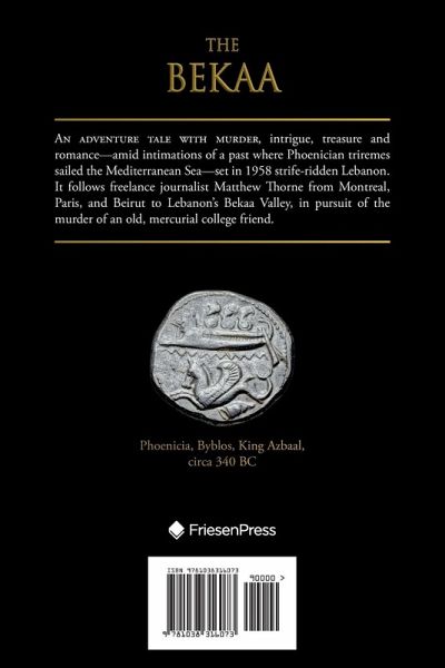 An adventure tale with murder, intrigue, treasure and romance-amid intimations of a past where Phoenician triremes sailed the Mediterranean Sea-set in 1957 strife-ridden Lebanon. It follows freelance journalist Matthew Thorne from Montreal, Paris, and Beirut to Lebanon's Bekaa Valley, in pursuit of the murder of an old, mercurial college friend.