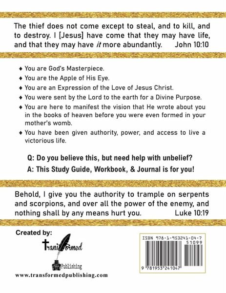 You are God's Masterpiece. You are the Apple of His Eye. You are an Expression of the Love of Jesus Christ. You were sent by the Lord to the earth for a Divine Purpose. You are here to manifest the vision that He wrote about you in the books of heaven before you were even formed in your mother's womb. You have been given authority, power, and access to live a victorious life. Q: Do you believe this, but need help with unbelief? A: This Study Guide, Workbook, & Journal is for you! This Study Guide, Workbook, & Journal is broken down into six sessions. It is recommended that you spend an entire week of devotional time studying, meditating, praying, and journaling on each topic. Additional journaling pages are located in the back of this book. The Word of God is meant to cleanse, transform, refresh, & renew our minds. Mind transformation is a continuous process that we must do diligently. Ultimately, we must 'lose our mind' and let the mind of Christ root and take dominion in our mind.