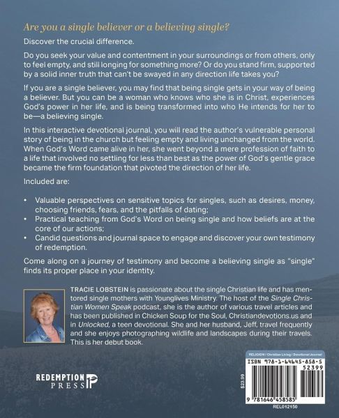 Are you a single believer or a believing single? Discover the crucial difference. Do you seek your value and contentment in your surroundings or from others, only to feel empty, and still longing for something more? Or do you stand firm, supported by a solid inner truth that can't be swayed in any direction life takes you? If you are a single believer, you may find that being single gets in your way of being a believer. But you can be a woman who knows who she is in Christ, experiences God's power in her life, and is being transformed into who He intends for her to be-a believing single. In this interactive devotional journal, you will read the author's vulnerable personal story of being in the church but feeling empty and living unchanged from the world. When God's Word came alive in her, she went beyond a mere profession of faith to a life that involved no settling for less than best as the power of God's gentle grace became the firm foundation that pivoted the direction of her life. Included are: Valuable perspectives on sensitive topics for singles, such as desires, money, choosing friends, fears, and the pitfalls of dating; Practical teaching from God's Word on being single and how beliefs are at the core of our actions; Candid questions and journal space to engage and discover your own testimony of redemption. Come along on a journey of testimony and become a believing single as "single" finds its proper place in your identity.