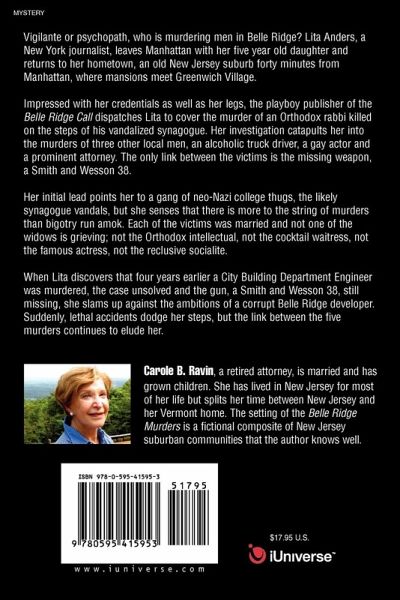 Vigilante or psychopath, who is murdering men in Belle Ridge? Lita Anders, a New York journalist, leaves Manhattan with her five year old daughter and returns to her hometown, an old New Jersey suburb of Manhattan, where mansions meet Greenwich Village. Impressed with her credentials as well as her legs, the playboy publisher of the Belle Ridge Call dispatches Lita to cover the murder of an Orthodox rabbi killed on the steps of his vandalized synagogue which catapults her into the murders of three other local men, an alcoholic truck driver, a gay actor, and a prominent attorney. The only link between the victims is the missing weapon, a Smith and Wesson 38. Her initial investigation points to a gang of neo-Nazi college thugs that have hassled the actor and truck driver and are the likely synagogue vandals, but there is more to the string of murders than bigotry gone amok. Each of the victims was married and not one of the widows is grieving; not the Orthodox intellectual, not the cocktail waitress, not the famous actress nor the reclusive socialite. Have they been abused? Have they banded together and hired a hit man? When Lita uncovers the unsolved murder of a member of a town planning board, shot with a Smith and Wesson 38, gun still missing, she is hunted by a vicious adversary but the link between all five murders continues to elude her.