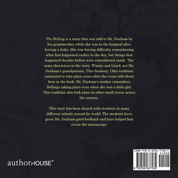 The Belling is a story that was told to Mr. Durham by his grandmother while she was in the hospital after having a stoke. She was having difficulty remembering what had happened earlier in the day, but things that happened decades before were remembered easily. The main characters in the story, Winnie and Lloyd, are Mr. Durham’s grandparents. This Sunbury, Ohio tradition continued to take place years after the event told about here in the book. Mr. Durham’s mother remembers Bellings taking place even when she was a little girl. This tradition also took place in other small towns across the country. This story has been shared with students in many different schools around he world. The students have given Mr. Durham good feedback and have helped him revise the manuscript.