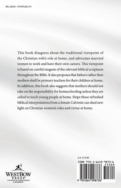 This book disagrees about the traditional viewpoint of the Christian wife's role at home, and advocates married women to work and have their own careers. This viewpoint is based on careful exegesis of the relevant biblical scriptures throughout the Bible. It also proposes that fathers rather than mothers shall be primary teachers for their children at home. In addition, this book also suggests that mothers should not take on the responsibility for homeschooling unless they are called to teach young people at home. Hope these refreshed biblical interpretations from a female Calvinist can shed new light on Christian women's roles and virtue at home.