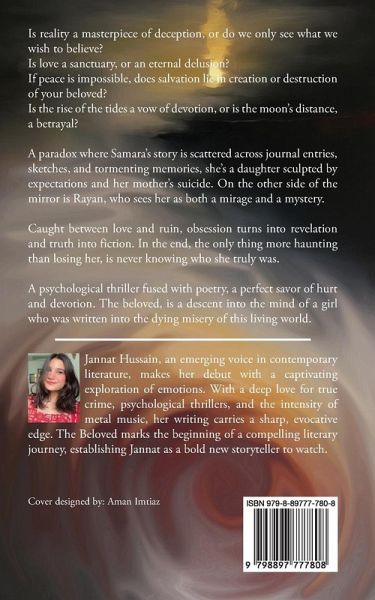 Is reality a masterpiece of deception, or do we only see what we wish to believe? Is love a sanctuary, or an eternal delusion? If peace is impossible, does salvation lie in creation or destruction of your beloved? Is the rise of the tides a vow of devotion, or is the moon's distance, a betrayal? A paradox where Samara's story is scattered across journal entries, sketches, and tormenting memories, she's a daughter sculpted by expectations and her mother's suicide. On the other side of the mirror is Rayan, who sees her as both a mirage and a mystery. Caught between love and ruin, obsession turns into revelation and truth into fiction. In the end, the only thing more haunting than losing her, is never knowing who she truly was. A psychological thriller fused with poetry, a perfect savor of hurt and devotion. The beloved, is a descent into the mind of a girl who was written into the dying misery of this living world.