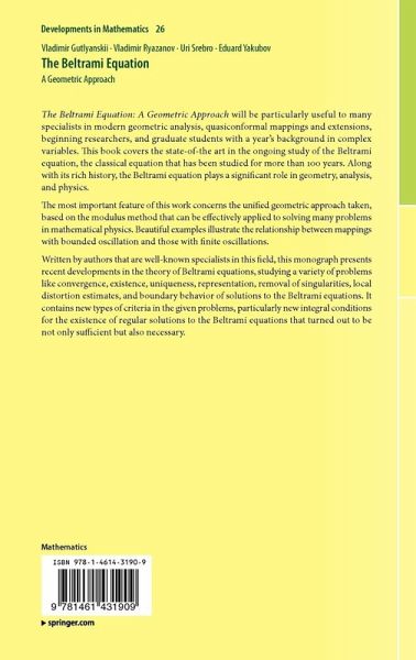 The most important feature of this book concerns the unified geometric approach based on the modulus method that is effectively applied to solving the mentioned problems. Moreover, it is characteristic for the book application of many new concepts as strong ring solutions, tangent dilatations, weakly flat and strongly accessible boundaries, functions of finite mean oscillations and new integral conditions that make possible to realize a more deep and refined analysis of problems related to the Beltrami equations. Mastering and using these new tools also gives essential advantages for the reader in the research of modern problems in many other domains. Every mathematics graduate library should have a copy of this book.