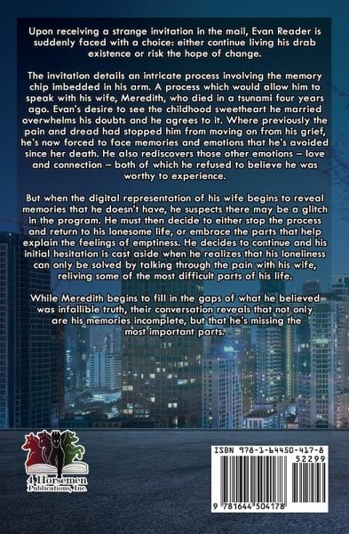 Upon receiving a strange invitation in the mail, Evan Reader is suddenly faced with a choice: either continue living his drab existence or risk the hope of change. The invitation details an intricate process involving the memory chip imbedded in his arm. A process which would allow him to speak with his wife, Meredith, who died in a tsunami four years ago. Evan's desire to see the childhood sweetheart he married overwhelms his doubts and he agrees to it. Where previously the pain and dread had stopped him from moving on from his grief, he's now forced to face memories and emotions that he's…mehr