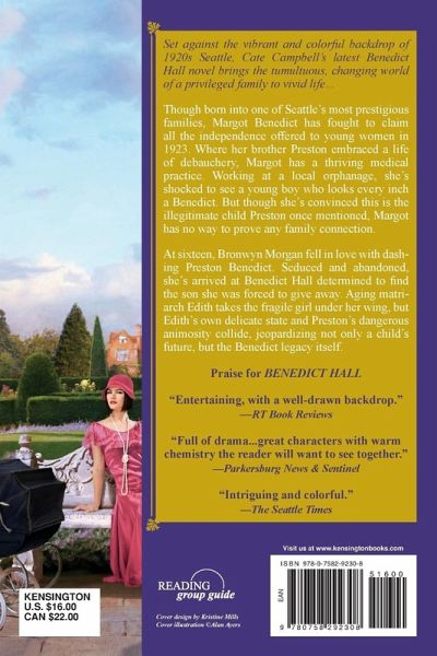 "Recommended for fans of Downton Abbey." --Parkersburg News & Sentinel Set against the vibrant and colorful backdrop of 1920s Seattle, Cate Campbell's latest Benedict Hall novel brings the tumultuous, changing world of a privileged family to vivid life. . . Though born into one of Seattle's most prestigious families, Margot Benedict has fought to claim all the independence offered to young women in 1923. Where her brother Preston embraced a life of debauchery, Margot has a thriving medical practice. Working at a local orphanage, she's shocked to see a young boy who looks every inch a Benedict. But though she's convinced this is the illegitimate child Preston once mentioned, Margot has no way to prove any family connection. At sixteen, Bronwyn Morgan fell in love with dashing Preston Benedict. Seduced and abandoned, she's arrived at Benedict Hall determined to find the son she was forced to give away. Aging matriarch Edith takes the fragile girl under her wing, but Edith's own delicate state and Preston's dangerous animosity collide, jeopardizing not only a child's future, but the Benedict legacy itself. Praise For Benedict Hall "Entertaining, with a well-drawn backdrop." --RT Book Reviews "Full of drama. . .great characters with warm chemistry the reader will want to see together." --Parkersburg News & Sentinel "Intriguing and colorful." --The Seattle Times