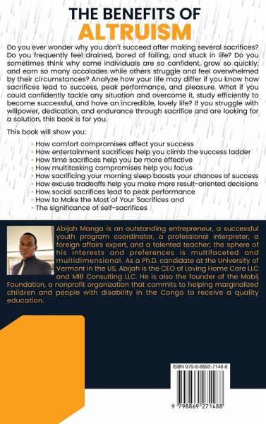 Do you ever wonder why you don't succeed after making several sacrifices? Do you frequently feel drained, bored of failing, and stuck in life? Do you sometimes wonder why some individuals are so confident, proliferate, and earn so many accolades while others struggle and feel overwhelmed by their circumstances? Analyze how your life may differ if you know how sacrifices lead to success, peak performance, and pleasure. What if you could confidently tackle and overcome any situation, study efficiently to succeed, and have an incredible, lovely life? If you struggle with willpower, dedication, and endurance through sacrifice and are looking for a solution, this book is for you. This book will show you How sometimes comfort compromises affect people's success, How entertainment sacrifices can help you climb the success ladder, How social sacrifices can lead to peak performance, How time sacrifices can help to be more effective, How sacrificing your morning sleep can boost chances of success and, the significance of altruism.