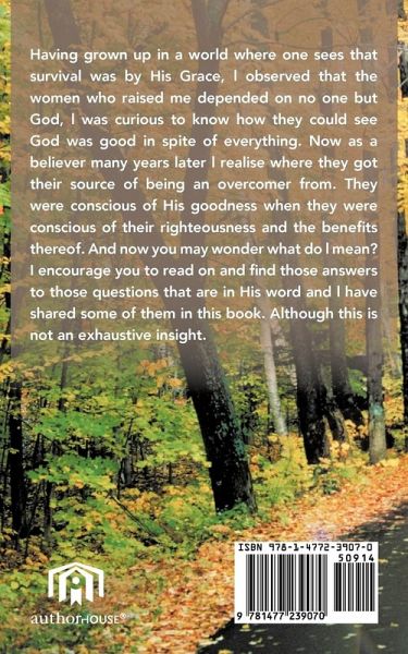 Having grown up in a world where one sees that survival was by His Grace, l saw how the women who brought me up dependant on no one but God, l was curious to know how they could see God was good in spite of. Now as a believer many years later l realise where they got their source of being an overcomer from. There were conscious of His goodness when there were conscious of their righteousness and the benefits thereof. And now you may wonder what do l mean? l encourage you to read on and find those answers to those questions that are in His word and l have shared some of them in this book. Although this is not an exhaustive insight.