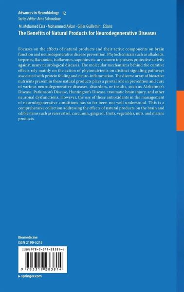 "This is a collection of papers on the use of natural products for a variety of neurodegenerative diseases. The purpose is to validate the use of natural products for the treatment of neurodegenerative diseases. The objectives are worthy as there is a need for clinicians and researchers to consider the value of safer natural products for treatment. ... written primarily for researchers, but it is also useful for clinicians. It is an attempt to spur further research into natural products." (Paul Joseph Ratte, Doody's Book Reviews, December, 2016)