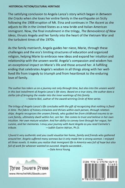 The satisfying conclusion to Angela Lanza's story which began in Between the Cracks when she loses her entire family in the earthquake on Sicily following the 1908 eruption of Mt. Etna and continues in The Ascent as she adjusts to life in the United States as a new bride and Italian American immigrant. Now, in the final installment in the trilogy, The Benevolence of New Ideas, thrusts Angela and her family into the heart of the Vietnam War and the turbulent times of the 1970s. As the family matriarch, Angela guides her niece, Marie, through these challenges and the era's limiting structures of education and organized religion, helping Marie to embrace new ideas and expand her intuition and relationship with the unseen world. Angela's compassion and wisdom has an exceptional impact on Marie's life and those around her. A fulfilling ending that celebrates Angela's wisdom in all things along with her well-lived life from tragedy to triumph and from heartbreak to the enduring love of family.