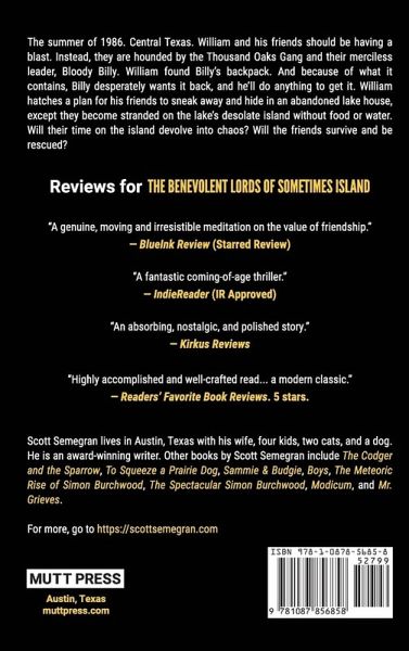 "A fantastic coming-of-age thriller." - IndieReader (IR Approved) 2021 First Place for Middle-Grade/Young Adult - Writer's Digest Self-Published Book Awards¿ 2021 Shortlisted - U.S. Selfies Book Awards 2020 Quarter Finalist for Young Adult Fiction - The BookLife Prize The summer of 1986. Central Texas. William and his friends should be having a blast. Instead, they are hounded by the Thousand Oaks Gang and their merciless leader, Bloody Billy. William found Billy's backpack. And because of what it contains, Billy desperately wants it back, and he'll do anything to get it. William hatches a plan for his friends to sneak away and hide in an abandoned lake house, except they become stranded on the lake's desolate island without food or water. Will their time on the island devolve into chaos? Will the friends survive and be rescued? The Benevolent Lords of Sometimes Island is Lord of the Flies meets The Body by Stephen King, the inspiration for the classic movie Stand By Me. A gripping suspense story with adventure and danger, tinged with humorous banter between the four friends, the middle schoolers face certain death without adults to protect them from the unrelenting natural elements, as well as the wild creatures that lurk in the wilderness around the lake. With a backpack filled with money and marijuana they stole from the merciless gang leader, it's only a matter of time before the high schoolers come looking for them, too. From award-winning writer Scott Semegran, The Benevolent Lords of Sometimes Island is his eighth book. This novel is Semegran's response to William Golding's 1954 novel Lord of the Flies, which was Golding's response to The Coral Island by R. M. Ballantyne, an adventure novel from 1858. All three novels tackle the premise of boys stranded on an island, with Semegran's novel taking a decidedly modern view of a group of friends in Central Texas during the summer of 1986 working to survive in a situation filled with danger and desperation with only each other to rely on.