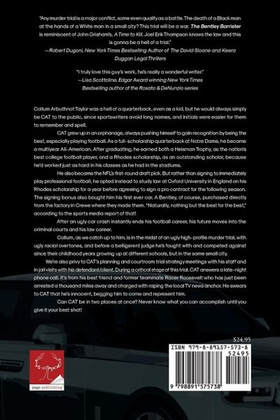 Collum Arbuthnot Taylor was a hell of a quarterback, even as a kid, but he would always simply be CAT to the public, since sportswriters avoid long names, and initials were easier for them to remember and spell. CAT grew up in an orphanage, always pushing himself to gain recognition by being the best, especially playing football. As a full-scholarship quarterback at Notre Dame, he became a multiyear All-American. After graduating, he earned both a Heisman Trophy, as the nation's best college football player, and a Rhodes scholarship, as an outstanding scholar, because he'd worked just as hard in his classes as he had in the stadiums. He also became the NFL's first-round draft pick. But rather than signing to immediately play professional football, he opted instead to study law at Oxford University in England on his Rhodes scholarship for a year before agreeing to sign a pro contract for the following season. The signing bonus also bought him his first ever car. A Bentley, of course, purchased directly from the factory in Crewe where they made them. "Naturally, nothing but the best for the best," according to the sports media report of that! After an ugly car crash instantly ends his football career, his future moves into the criminal courts and his law career. Collum, as we catch up to him, is in the midst of an ugly high-profile murder trial, with ugly racial overtones, and before a belligerent judge he's fought with and competed against since their childhood years growing up at different schools, but in the same small city. We're also privy to CAT's planning and courtroom trial strategy meetings with his staff and in jail visits with his defendant/client. During a critical stage of this trial. CAT answers a late-night phone call. It's from his best friend and former teammate Racer Roosevelt who has just been arrested a thousand miles away and charged with raping the local TV news anchor. He swears to CAT that he's innocent, begging him to come and represent him. Can CAT be in two places at once? Never know what you can accomplish until you give it your best shot!