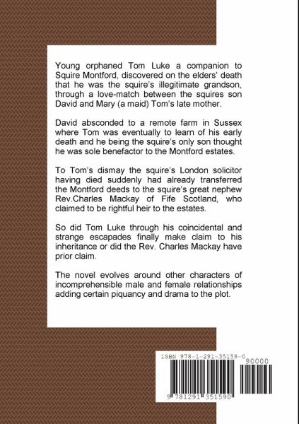 Young orphaned Tom Luke a companion to Squire Montford, discovered on the elders' death that he was the squire's illegitimate grandson, through a love-match between the squires son David and Mary (a maid) Tom's late mother. David absconded to a remote farm in Sussex where Tom was eventually to learn of his early death and he being the squire's only son thought he was sole benefactor to the Montford estates. To Tom's dismay the squire's London solicitor having died suddenly had already transferred the Montford deeds to the squire's great nephew Rev.Charles Mackay of Fife Scotland, who claimed to be rightful heir to the estates. So did Tom Luke through his coincidental and strange escapades finally make claim to his inheritance or did the Rev. Charles Mackay have prior claim. The novel evolves around other characters of incomprehensible male and female relationships adding certain piquancy and drama to the plot.