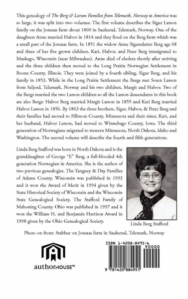 This genealogy of The Berg & Larson Families from Telemark, Norway to America was so large, it was split into two volumes. The first volume describes the Sigur Larson family on the Jonsaas farm about 1800 in Sauherad, Telemark, Norway. One of the daughters Anne married Halvor in 1814 and they lived on the Berg farm which was a small part of the Jonsaas farm. In 1851 the widow Anne Sigursdatter Berg age 68 and three of her five grown children, Kari, Halvor, and Peter Berg immigrated to Muskego, Wisconsin (near Milwaukee). Anne died of cholera shortly after arriving and the three children then moved to the Long Prairie Norwegian Settlement in Boone County, Illinois. They were joined by a fourth sibling, Sigur Berg, and his family in 1853. While in the Long Prairie Settlement the Bergs met Soren Larson from Seljord, Telemark, Norway and his two children, Margit and Halvor. Two of the Bergs married the two Larson children so all the Larson descendants in this book are also Bergs: Halvor Berg married Margit Larson in 1855 and Kari Berg married Halvor Larson in 1856. By 1863 the three brothers, Sigur, Halvor, & Peter Berg and their families had moved to Fillmore County, Minnesota and their sister, Kari, and her husband, Halvor Larson, had moved to Winnebago County, Iowa. The third generation of Norwegians migrated to western Minnesota, North Dakota, Idaho and Washington. The second volume will describe the fourth and fifth generations.
