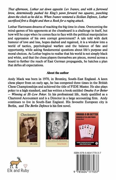 That afternoon, Lothar sat down opposite Lev Ivanov, and with a furrowed brow, determinedly pushed his King's pawn forward two squares, punching down the clock as he did so. When Ivanov ventured a Sicilian Defence, Lothar sacrificed first a Knight and then a Rook for a raging attack. Lothar Hartmann dreams of reaching the big time in chess. Overcoming the mind-games of his opponents at the chessboard is a challenge in itself, but how will he cope when he comes face to face with the political manipulation and oppression of his own corrupt government? A tale told with dark humour of love and loss, hopes dashed and regained, it is a window into a world of tactics, psychological warfare and the balance of fate and opportunity, while asking fundamental questions about life's purpose and moral choices. As Lothar begins to realise that his world is not simply black and white, and that the chess players themselves are pieces, moved across a board to further the reach of East German propaganda, he hatches a plan that defies all expectations.