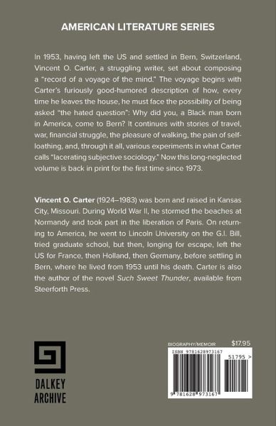 1. Now is the time to (re)discover Carter's work-now back in print for the first time since the 1970s. 2. Vincent O. Carter has been compared to other ex-pat black writers of his time, notably James Baldwin and Richard Wright. Unlike those novelists-now in the pantheon of black literature-Carter drew scant attention. 3. Promotional opportunities for Black History Month