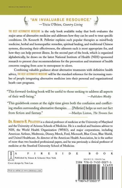 The Best Alternative Medicine is the only book available today that both evaluates the major areas of alternative medicine and addresses how they can be used to treat specific conditions. Dr. Kenneth R. Pelletier explains such popular therapies as mind/body medicine, herbal and homeopathic remedies, spiritual healing, and traditional Chinese systems, discussing their effectiveness, the ailments each is most appropriate for, and how they can help prevent illness. In the second part of the book, which is organized alphabetically, he draws on the latest National Institute of Health (NIH)-sponsored research to present clear recommendations for the prevention and treatment of health concerns ranging from acne to menopause to ulcers. Combining valuable guidance about alternative treatments with definitive health advice, The Best Alternative Medicine will be the standard reference for the increasing number of people integrating alternative medicine into their personal and organizational heath-care programs.