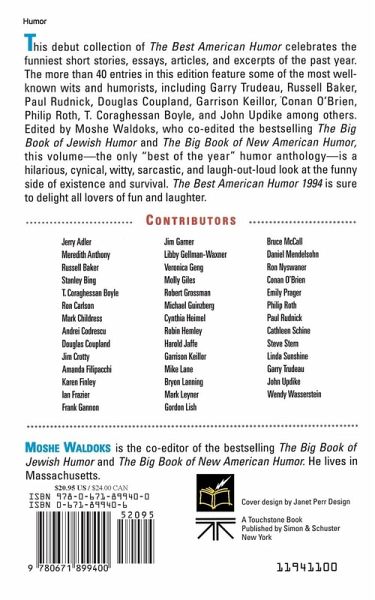 This debut collection of "The Best American Humor" celebrates the funniest short stories, essays, articles, and excerpts of the past year. The more than 40 entries in this edition feature some of the most well-known wits and humorists, including Garry Trudeau, Russell Baker, Paul Rudnick, Douglas Coupland, Garrison Keillor, Conan O'Brien, Philip Roth, T. Coraghessan Boyle, and John Updike among others. Edited by Moshe Waldoks, who co-edited the bestselling "The Big Book of Jewish Humor" and "The Big Book of New American Humor", this volume-- the only "best of the year" humor anthology-- is a hilarious, cynical, witty, sarcastic, and laugh-out-loud look at the funny side of existence and survival. "The Best American Humor 1994" is sure to delight all lovers of fun and laughter.