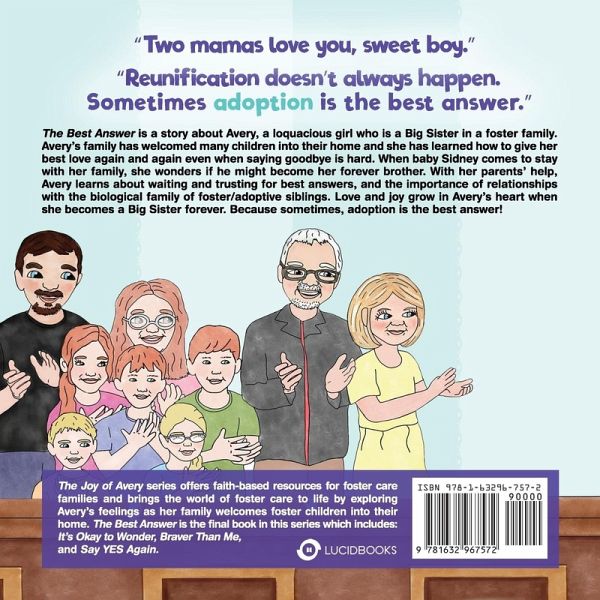 "Two mamas love you, sweet boy." "Reunification doesn't always happen. Sometimes adoption is the best answer." The Best Answer is a story about Avery, a loquacious girl who is a Big Sister in a foster family. Avery's family has welcomed many children into their home and she has learned how to give her best love again and again even when saying goodbye is hard. When baby Sidney comes to stay with her family, she wonders if he might become her forever brother. With her parents' help, Avery learns about waiting and trusting for best answers, and the importance of relationships with the biological family of foster/adoptive siblings. Love and joy grow in Avery's heart when she becomes a Big Sister forever. Because sometimes, adoption is the best answer. The Joy of Avery series offers faith-based resources for foster care families and brings the world of foster care to life by exploring Avery's feelings as her family welcomes foster children into their home. The Best Answer is the final book in this series which includes: It's Okay to Wonder, Braver Than Me and Say YES Again.