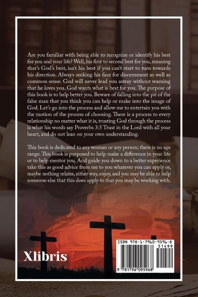 Are you familiar with being able to recognize or identify his best for you and your life? Well, his first to second best for you, meaning that's God's best, isn't his best if you can't start to turn towards his direction. Always seeking his face for discernment as well as common sense. God will never lead you astray without warning that he loves you. God wants what is best for you. The purpose of this book is to help better you beware of falling into the pit of the false man that you think you can help or make into the image of God. Let's go into the process and allow me to entertain you with the motion of the process of choosing. There is a process to every relationship no matter what it is, trusting God through the process is what his words say Proverbs 3:5 Trust in the Lord with all your heart, and do not lean on your own understanding. This book is dedicated to any woman or any person; there is no age range. This book is purposed to help make a difference in your life or to help mentor you. And guide you down to a better experience take this as good advice from me to you whatever you can apply or, maybe nothing relates, either way, enjoy, and, you may be able to help someone else that this does apply to that you may be working with.