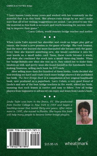 When Linda Tafet injured her shoulder and could no longer play golf or tennis, she found a new passion in the game of bridge. She took lessons, and the more she learned the more fascinated she became with the game. Every time she learned something new, she would condense it into her own words on a small index card. Soon, these cards became a stack, and then she combined the stack into a small three-ring binder. When her bridge friends saw what she was up to, they asked her to make them binders as well, and pretty soon she found herself in the handmade book-making business, selling each book for $75 each. After selling more than five hundred of these books, Linda decided she was working too hard and could reach more bridge players if she published her book. The Best Bridge Book is a compilation of her original handmade book, now produced as a paperback. Larry Cohen, a very good friend of Linda's and one of the best bridge teachers in the world, edited her book, ensuring that each lesson is correct and easy to follow. Now all bridge players from beginners to advanced can enjoy and learn from Linda's book.