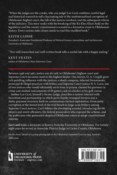 Between 1956 and 1967, justice was for sale in Oklahoma's highest court and Supreme Court decisions went to the highest bidder. One lawyer, O. A. Cargill, grew rich peddling influence with the justices; a shady company, Selected Investments, protected its illegal practices with bribes; and Supreme Court justice N. S. Corn, one of two justices who would ultimately serve time in prison, cheated his partners in crime and stashed vast amounts of ill-gotten cash in a locker at his golf course. Author Lee Card, himself a former judge, describes a system infected with favoritism and partisanship in which party loyalty trumped fairness and a shaky payment structure built on commissions invited exploitation. From petty corruption at the lowest level of the trial bench to large-scale bribery among Supreme Court justices, Card follows the developing scandal, introducing the bit players and worst offenders, the federal prosecutors who exposed the scheme, and the politicians who persuaded skeptical Oklahoma voters to adopt constitutional reforms. On one level, The Best Courts Money Could Buy is a compelling story of true crime and punishment set in the capitol of an agricultural, oil-producing, conservative state. But on a deeper level, the book is a cautionary tale of political corruption-and the politics of restoring integrity, accountability, and honor to a broken system.