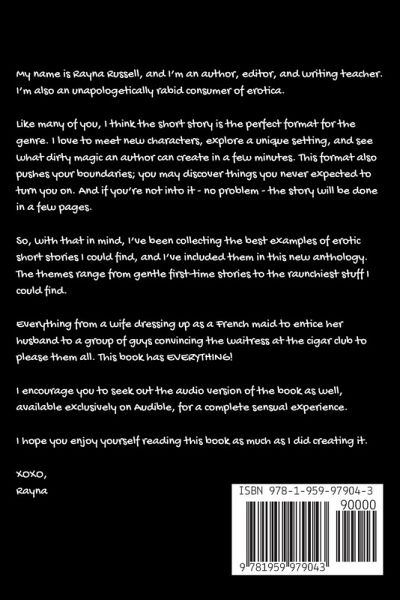 If you're looking for the hottest, filthiest collection of erotic short stories of the year, that will leave you breathless and satisfied, then keep reading… My name is Rayna Russell, and I'm an author, editor, and writing teacher. I'm also an unapologetically rabid consumer of erotica. Like many of you, I think the short story is the perfect format for the genre. I love to meet new characters, explore a unique setting, and see what dirty magic an author can create in a few minutes. This format also pushes your boundaries; you may discover things you never expected to turn you on. And if you're not into it - no problem - the story will be done in a few pages. So, with that in mind, I've been collecting the best examples of erotic short stories I could find, and I've included them in this new anthology. The themes range from gentle first-time stories to the raunchiest stuff I could find. Everything from a wife dressing up as a French maid to entice her husband to a group of guys convincing the waitress at the cigar club to please them all. This book has EVERYTHING! I encourage you to seek out the audio version of the book as well, available exclusively on Audible, for a complete sensual experience. I hope you enjoy yourself reading this book as much as I did creating it. XOXO, Rayna