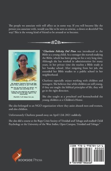 "Charlotte Felicity Del Pino was introduced to the Bible as a young child. As a teenager, she started studying the Bible, which has been going on for a very long time. Although she has worked in administration for many years, in her private time she teaches a Bible study at her Sunday school. After resigning from her job, she extended her Bible studies to a public school in her neighborhood.Charlotte especially enjoys working with children and teenagers. She believes that while children are still young if they are taught the biblical principles of life, they will go in the right direction. She also taught at a preschool and homeschooled young children at a Children's Home.She also belonged to an NGO organization where that assists abused men and women, and also children.Unfortunately, Charlotte passed away on April 12th, 2021 suddenly.She also did a course at the Rape Crisis Society of Trinidad and Tobago and studied Child Psychology at the University of the West Indies, Open Campus, Trinidad and Tobago."