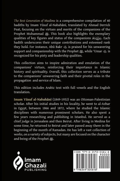 The Best Generation of Muslims is a comprehensive compilation of 40 hadiths by Imam Yusuf al-Nabahani, translated by Ahmad Derrick Peat, focusing on the virtues and merits of the Companions of the Prophet Muhammad ¿. This book also highlights the exemplary qualities of key figures and status of the Companions. Each hadith underscores their unique contributions and esteemed rank they hold. For instance, Abu Bakr is praised for his unwavering support and companionship with the Prophet ¿, while 'Umar is recognized for his piety and leadership qualities. This collection aims to inspire admiration and emulation of the Companions' virtues, reinforcing their importance in Islamic history and spirituality. Overall, this collection serves as a tribute to the Companions' unwavering faith and their pivotal roles in the propagation and service of Islam. This edition includes Arabic text with full vowels and the English translation. Imam Yusuf al-Nabahani (1849-1932) was an Ottoman-Palestinian scholar. After his initial studies in his locality, he studied in al-Azhar, Egypt, between 1866 and 1872, where he studied the Islamic disciplines with numerous prominent scholars.He also spent a few years researching and publishing in Istanbul. He served as a chief judge in Jerusalem and then Beirut. After living in Medina for some time, he returned to Beirut and later passed away there in the beginning of the month of Ramadan. He has left a vast collection of works, on a variety of subjects, but many are focused on the character and being of the Prophet ¿.