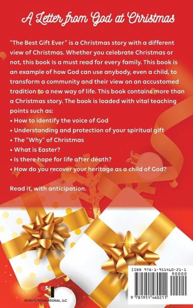 "The Best Gift Ever: A Letter From God at Christmas" is a Christmas story with a different view of Christmas. Whether you celebrate Christmas or not, this book is a must-read for every family. This book is an example of how God can use anybody, even a child, to transform a community and their view on an accustomed tradition, to revert to a new way of life. This book contains more than a Christmas story. The book is loaded with vital teaching points such as: How to identify the voice of God Understanding and protecting your spiritual gift The "Why" of Christmas What is Easter? Is there hope for life after death? How do you recover your heritage as a child of God? And many more. The Best Gift Ever is a story of a King, a Prince of Peace, and a lover of souls, who paid a sacrificial penalty for his citizens out of love. He took the punishment due to them, even though the citizens deserved to be punished because of disobedience. The book tells the story of this king, how he came to be, why he did what he did, and for what benefit. Also, it tells how the King's gift affected a young girl whose mission became to announce the King to the world. For the world to embrace and benefit from the ways of this King.