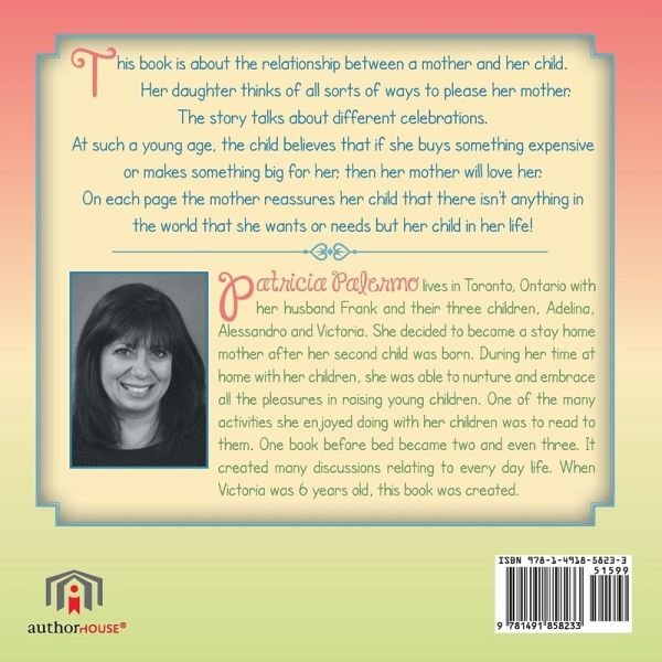 This book is about the relationship between a mother and her child. Her daughter thinks of all sorts of ways to please her mother. The story talks about different celebrations. At such a young age the child believes that if she buys something expensive or make something big for her, then her mother will love her. On each page the mother reassures her child that there isn't anything in the world that she wants or needs but her child in her life!