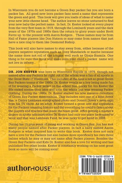 In Wisconsin you do not become a Green Bay packer fan you are born a packer fan. All good new born packer fans need a name that represents the green and gold. This book will give you loads of ideas of what to name your new little cheese head. The author leaves no stone unturned to find your new baby the perfect name. In fact, Dr. Kester looked at every player from the very first team in 1919, through the Lombardi years and the dark years of the 1970s and 1980s then the return to glory years under Brett Favre up to the present with Aaron Rodgers.. These names may be from Hall of Fame players like Don Hutson or may come from names that just have a nice ring to them like Desmond Bishop. This book will also have names to stay away from, either because of the players negative reputation such as Tony Mandarich or maybe because the name does not roll of the tongue well such as Gbaja-Biamila. One thing is for sure this book will make sure your child's packer name will not live in infamy.