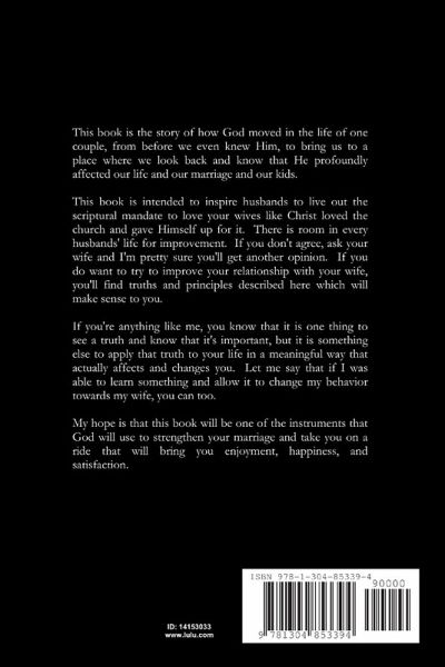 This book is the story of how God moved in the life of one couple from before we even knew Him to bring us to a place where we look back and know that He profoundly affected our life and marriage and our kids. This book is intended to inspire husbands to live out the scriptural mandate to love your wives like Christ loved the church, He gave Himself up for it. There is room in every husbands life for improvement. If you don't agree, ask your wife and I'm pretty sure you'll get another opinion. If you do want to try to improve your relationship with your wife, you'll find truths and principles described which will make sense to you. It is one thing to see a truth and know that it's important but it is something else again to apply that truth to your life in a meaningful way that actually affects and changes you. My hope is that this book will be one of the instruments that God will use to strengthen your marriage and take you on a ride that will bring you enjoyment, happiness, and satisfaction.