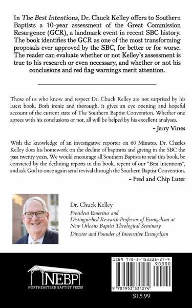 In The Best Intentions, Dr. Chuck Kelley offers to Southern Baptists a 10-year assessment of the Great Commission Resurgence (GCR), a landmark event in recent SBC history. The book identifies the GCR as one of the most transforming proposals ever approved by the SBC, for better or for worse. The reader can evaluate whether or not Kelley's assessment is true to his research or even necessary, and whether or not his conclusions and red flag warnings merit attention.