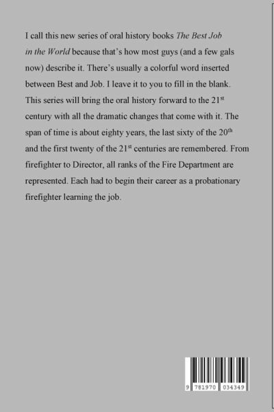 This new series of oral history books is called The Best Job in the World because that's how most guys (and a few gals now) describe it. There's usually a colorful word inserted between Best and Job. I leave it to you to fill in the blank. This series will bring the oral history forward to the 21st Century with all the dramatic changes that come with it. The span of time is about eighty years, the last sixty of the 20th and the first twenty of the 21st centuries are remembered. From firefighter to Director, all ranks of the Fire Department are represented. Each had to begin their career as a probationary firefighter learning the job.