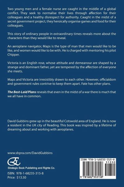 Two young men and a female nurse are caught in the middle of a global conflict. They seek to normalise their lives through affection for their colleagues and a healthy disrespect for authority. Caught in the midst of a secret government project, they heroically organise games and food for their colleagues. This story of ordinary people in extraordinary times reveals more about the characters than they would like to reveal. An aeroplane navigator, Maps is the type of man that men would like to be like, and women would like to be with. He is charged with mentoring his pilot Chipper. Victoria is an English rose, whose attitude and demeanour are shaped by a strange and dominant father, yet are tempered by the affection of everyone she meets. Maps and Victoria are irresistibly drawn to each other. However, officialdom and government rules contrive to keep them apart. Fate has other plans. The Best-Laid Plans reveals that even in the midst of a war there is much that we all have in common. (About the Author) David Gubbins grew up in the beautiful Cotswolds area of England. He is now a resident in the UK city of Reading. This book was inspired by a lifetime of dreaming about and working with aeroplanes.