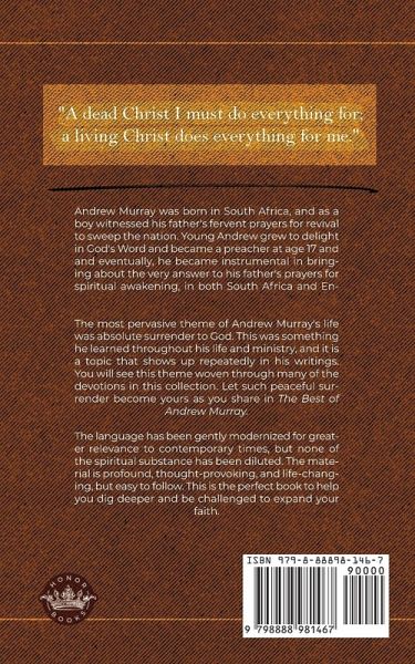Andrew Murray was born in South Africa, and as a boy witnessed his father's fervent prayers for revival to sweep the nation. Young Andrew grew to delight in God's Word and became a preacher at age 17 and and eventually, he became instrumental in bringing about the very answer to his father's prayers for spiritual awakening, in both South Africa and England. The most pervasive theme of Andrew Murray's life was absolute surrender to God. This was something he learned throughout his life and ministry, and it is a topic that shows up repeatedly in his writings. You will see this theme woven through many of the devotions in this collection. Let such peaceful surrender become yours as you share in The Best of Andrew Murray. The language has been gently modernized for greater relevance to contemporary times, but none of the spiritual substance has been diluted. The material is profound, thought-provoking, and life-changing, but easy to follow. This is the perfect book to help you dig deeper and be challenged to expand your faith.