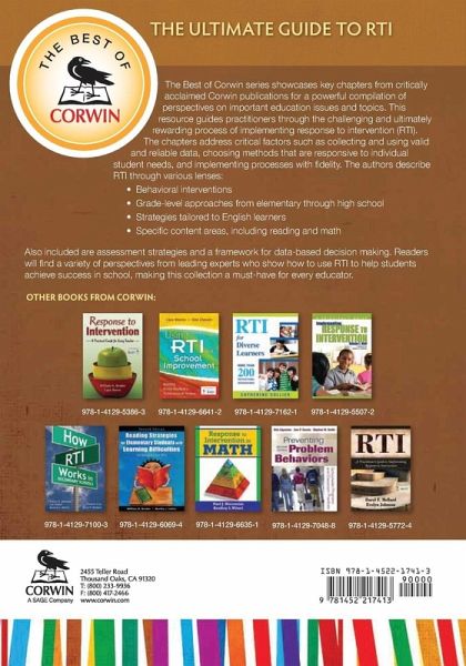 The ultimate guide to RTI This resource guides practitioners through the challenging and rewarding process of implementing response to intervention (RTI). The chapters address critical factors such as collecting and using valid and reliable data, choosing from methods that are responsive to individual student needs, and implementing processes with fidelity. The authors describe RTI through various lenses: Behavioral interventions Grade-level approaches from elementary through high school Strategies tailored to English learners Specific content areas, including reading and math Because RTI has the power to help students achieve success in school, this collection a must-have for every educator.